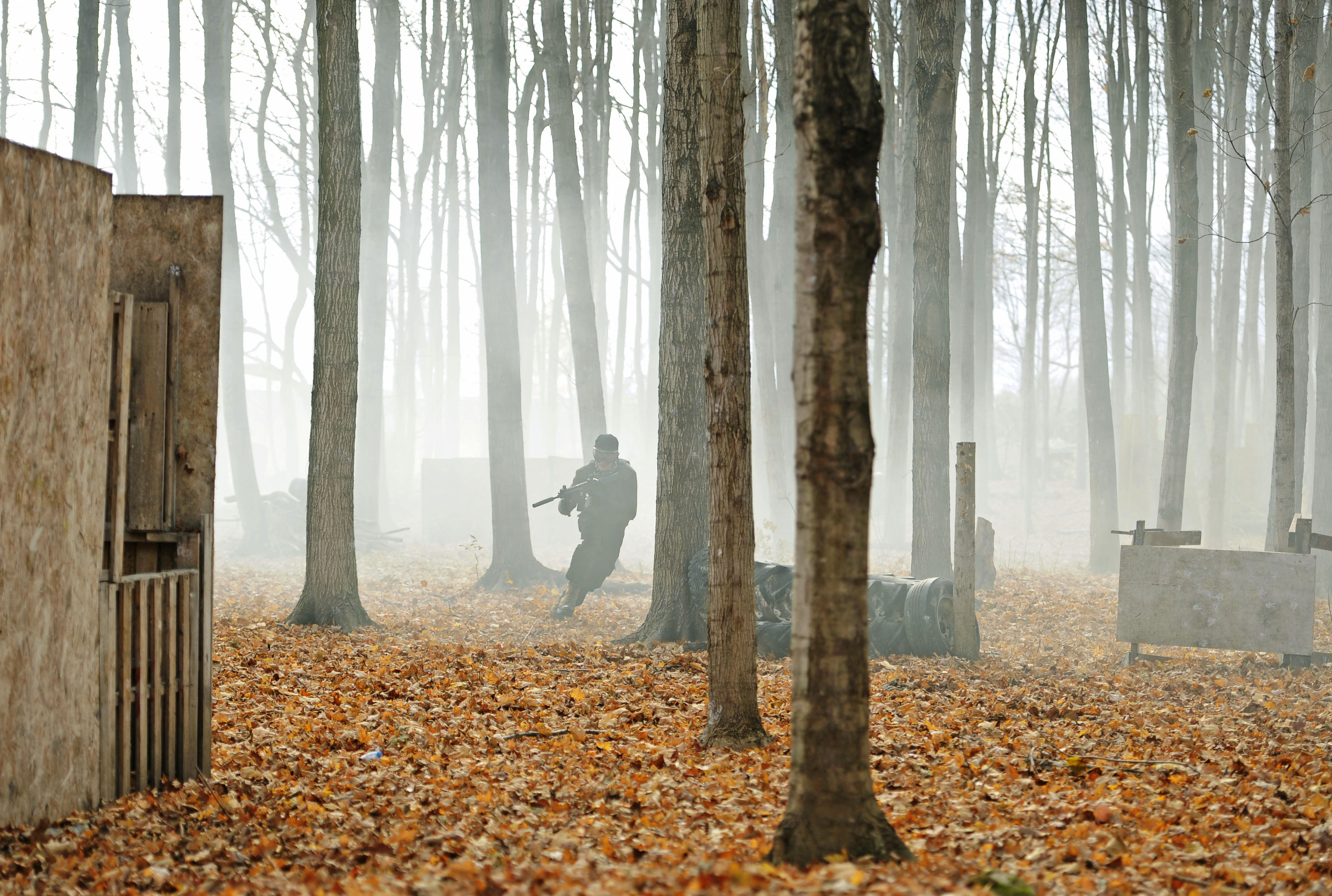 WELLINGTON, Ont. (01/11/14) A lone gunman breaks cover under the blanket of smoke set off by multiple grenades. Since the games take place in an entirely outdoor setting, event organizer Curtis Sprissler, says that the key to winning a match is to utilize the environment. Photo by Mary Barber, Loyalist College